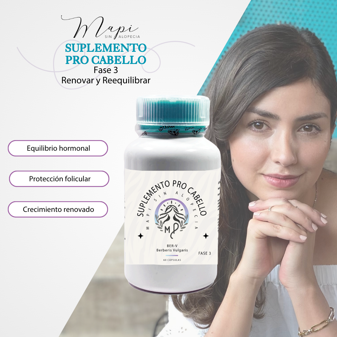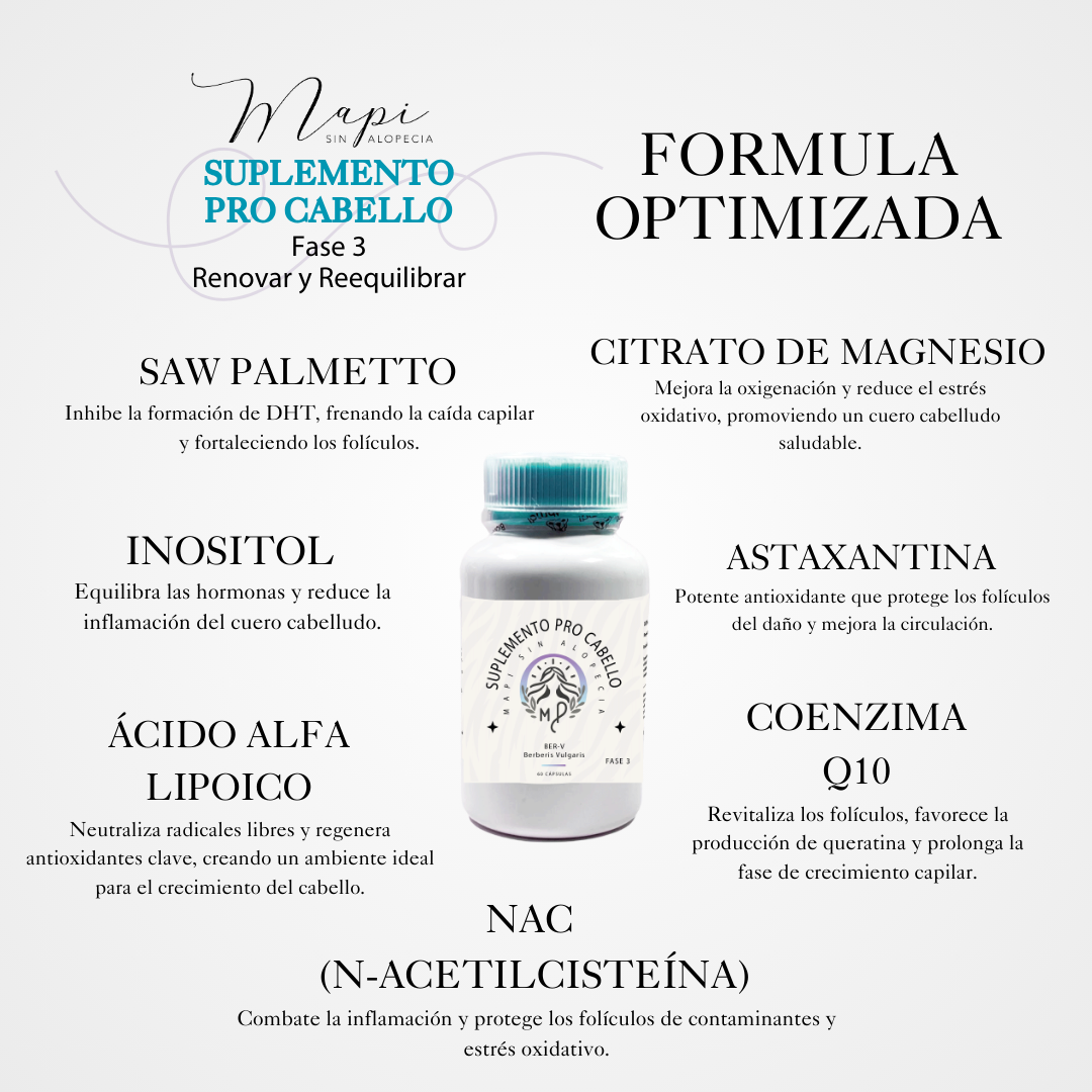 La fase de renovación capilar de Mapi sin Alopecia ha sido formulada con ingredientes clave que actúan sinérgicamente para reducir el impacto de los andrógenos en el folículo y restaurar el equilibrio natural del ciclo capilar. Aquí te presentamos los componentes esenciales de esta fase y cómo cada uno contribuye a combatir la caída y promover el crecimiento saludable: