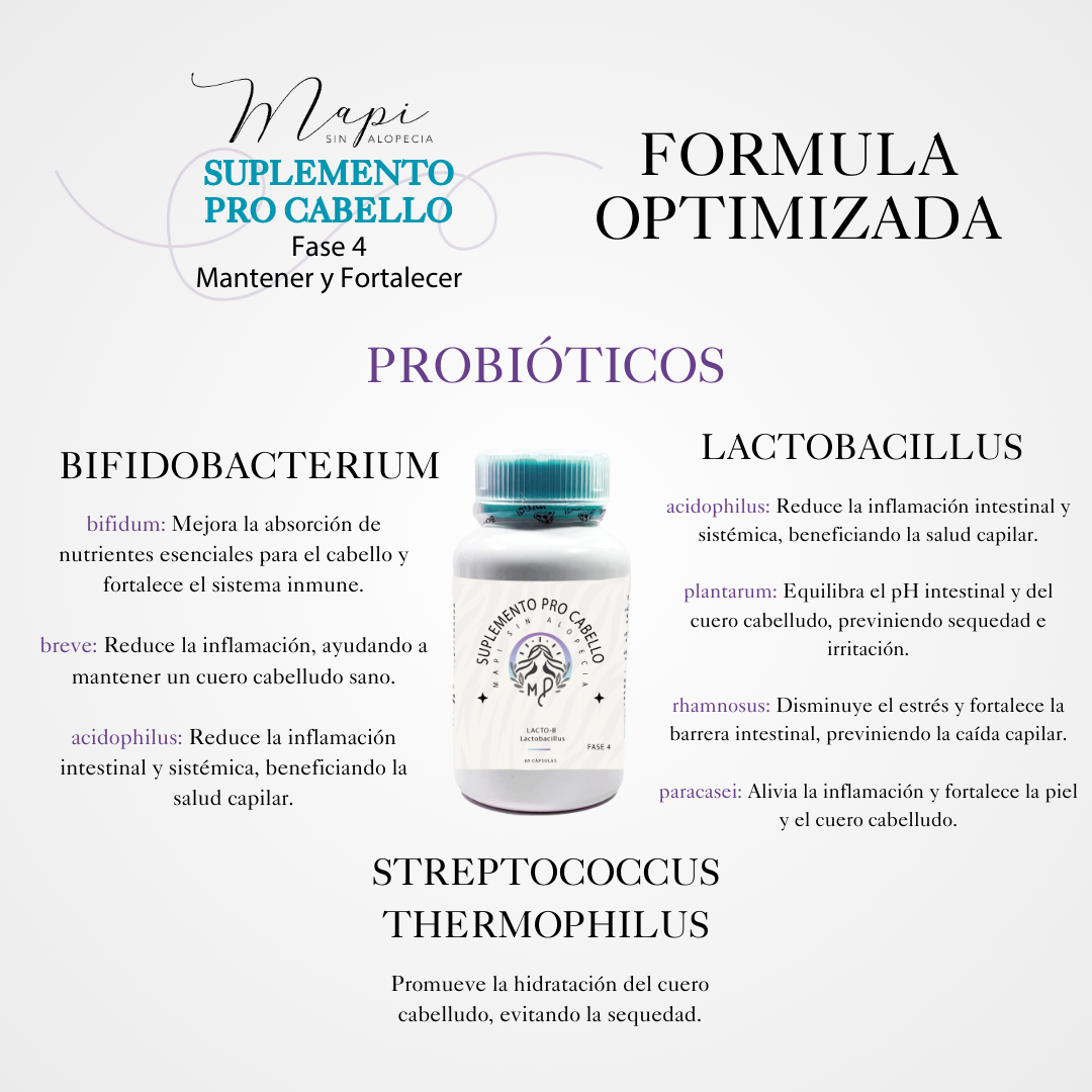 Probióticos (5 billones por cada cepa) La salud intestinal está directamente relacionada con la absorción de nutrientes y, por ende, con la salud capilar. Nuestros probióticos de alta calidad restauran el equilibrio de la microbiota intestinal, mejorando la digestión y la absorción de nutrientes esenciales para el cabello. Al mantener un intestino saludable, los probióticos aseguran que vitaminas y minerales lleguen adecuadamente al cuero cabelludo y los folículos, apoyando un crecimiento capilar constante y saludable: